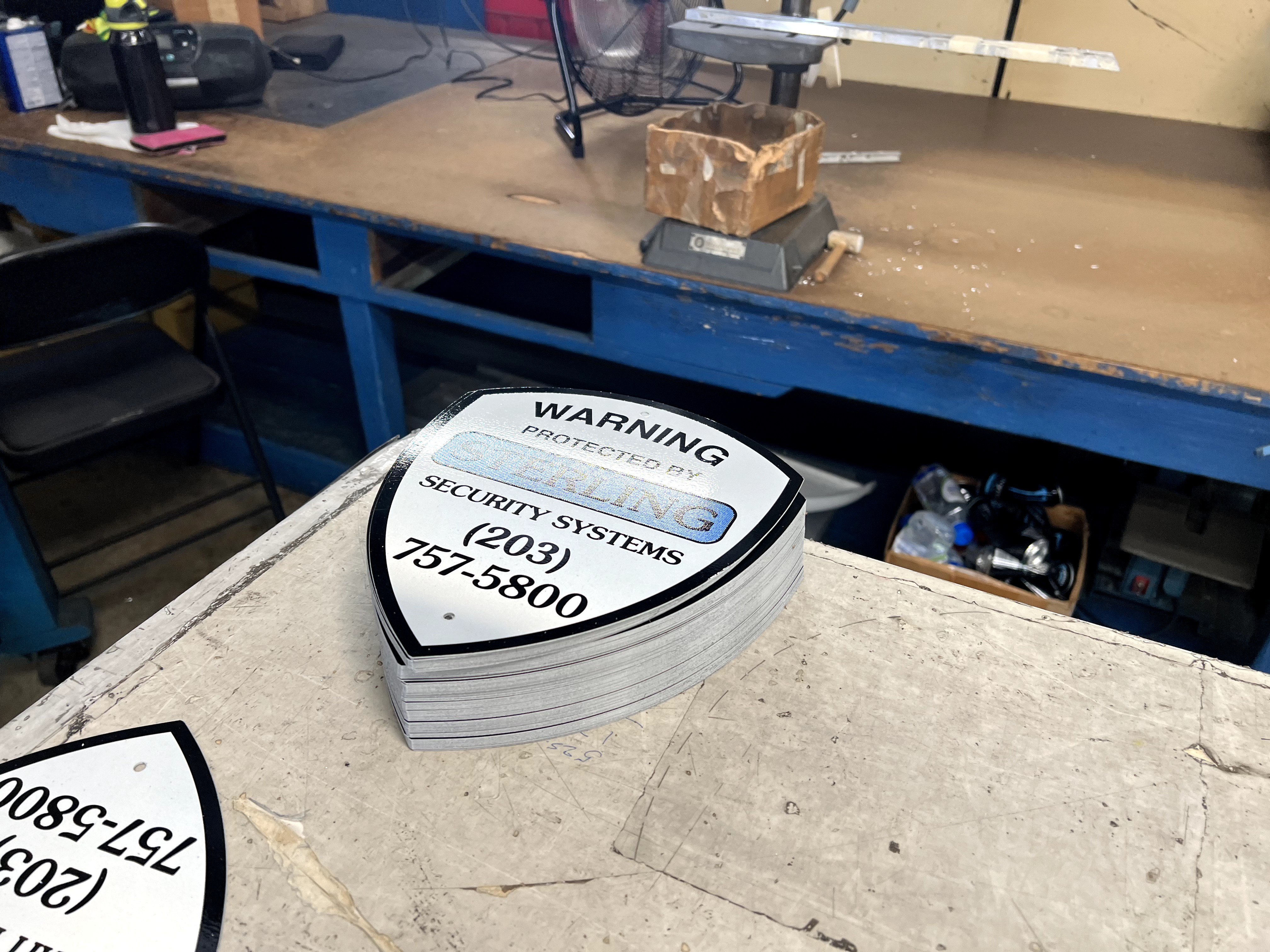Professional security sign featuring a shield design with 3 colors, 3 mounting holes. Perfect for security businesses. Get a free quote today!