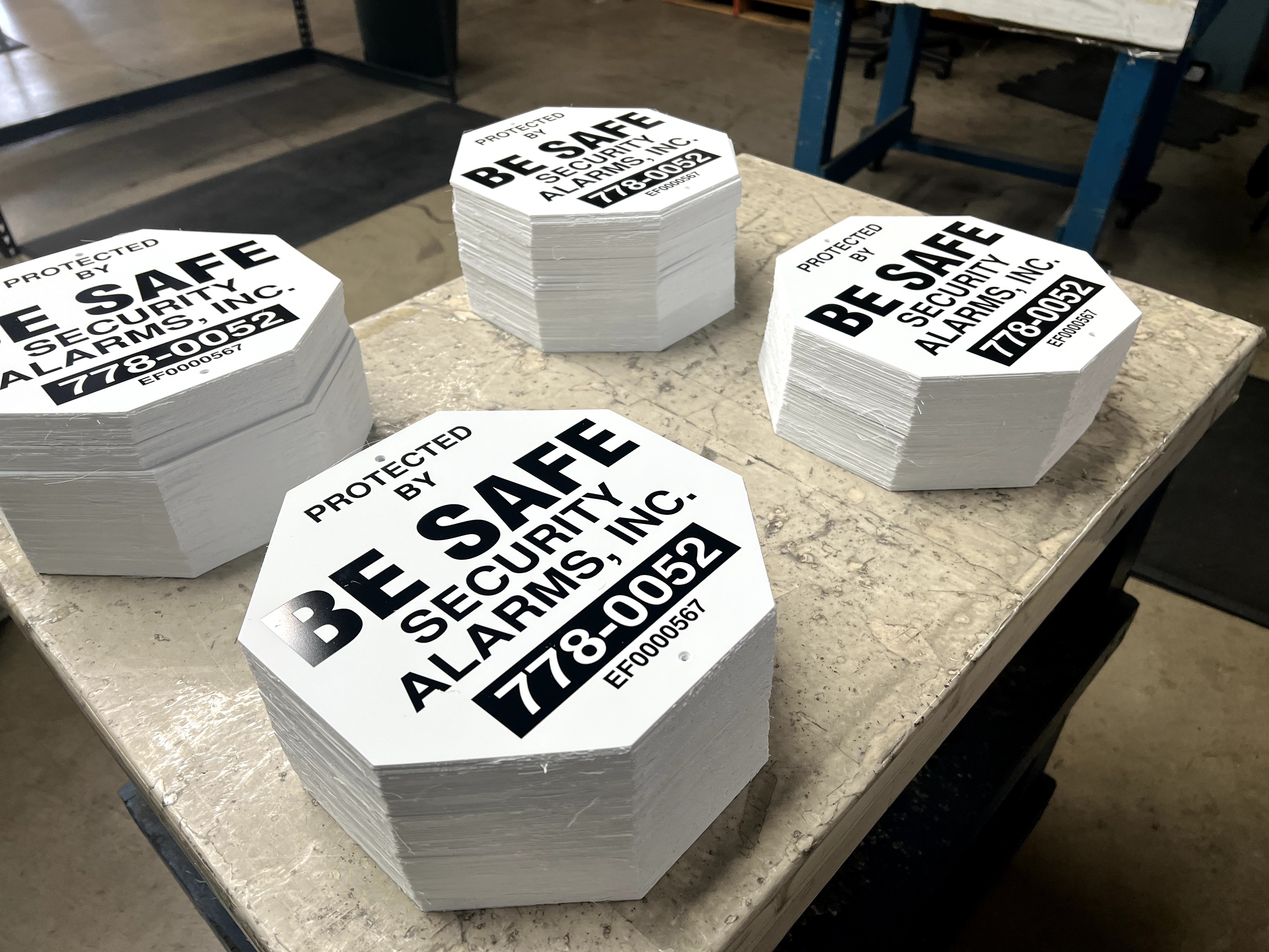 Professional security sign featuring a elongated octagon design with 1 color. Perfect for security businesses. Get a free quote today!