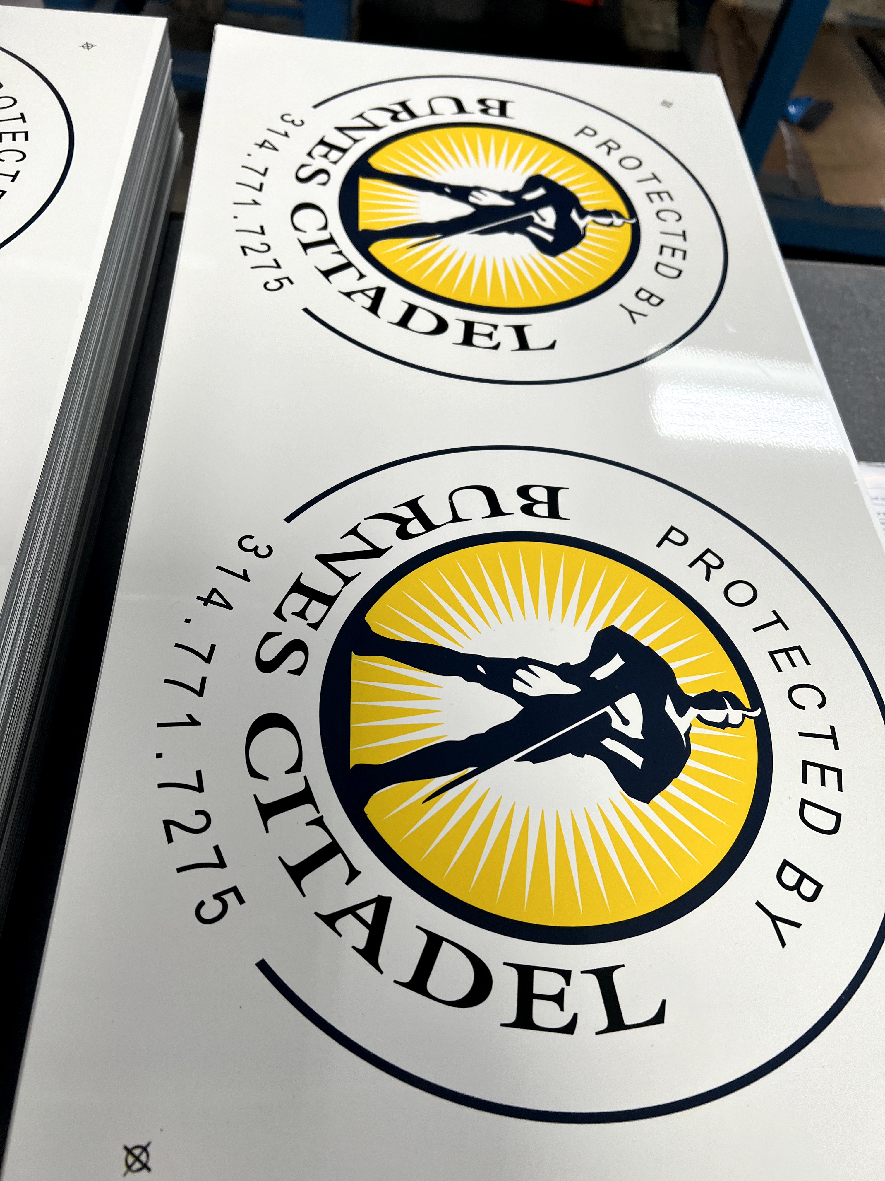 Custom black and gold circle sign for security businesses