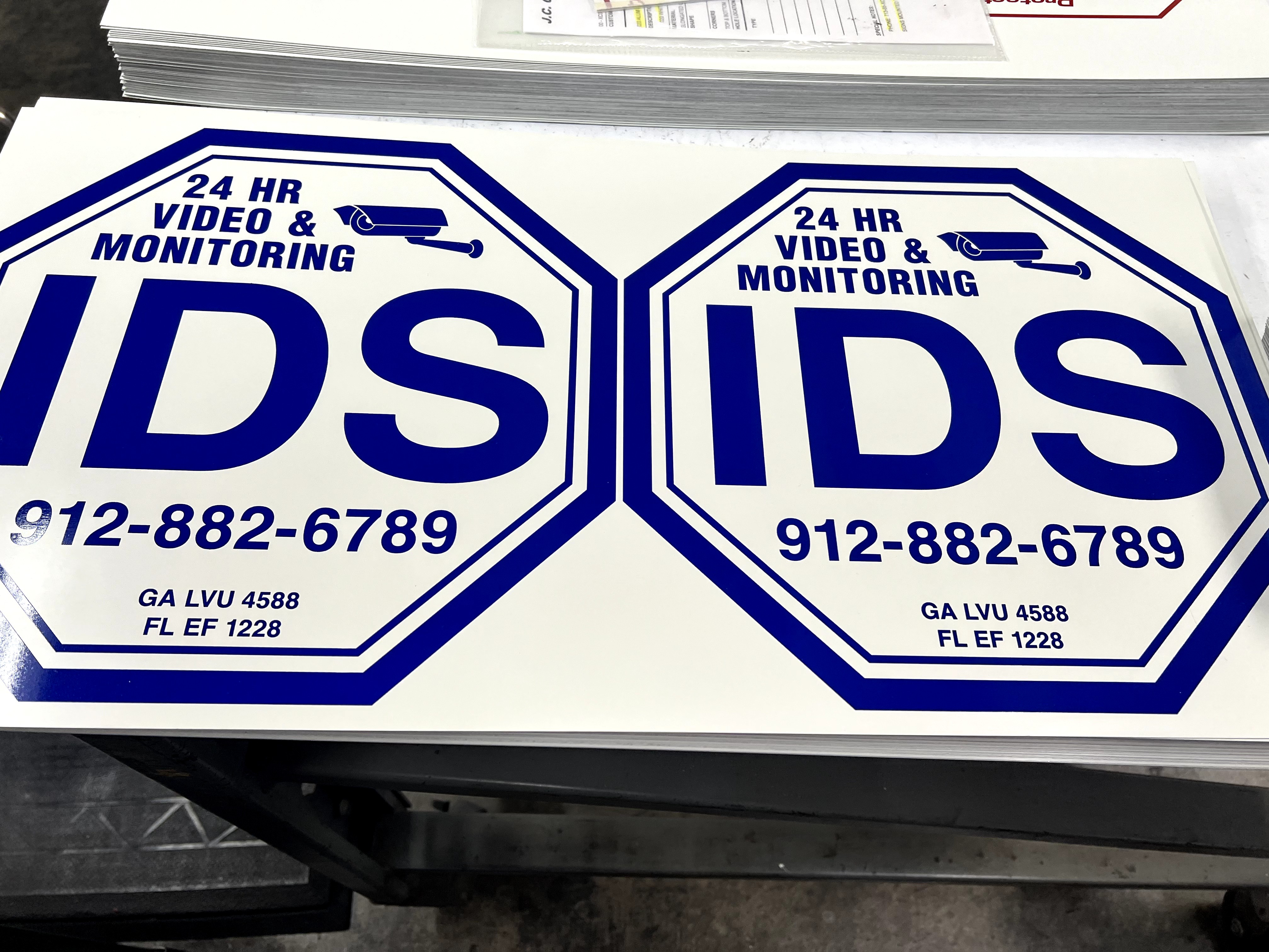 Professional security sign featuring a elongated octagon design with 1 color. Perfect for security businesses. Get a free quote today!