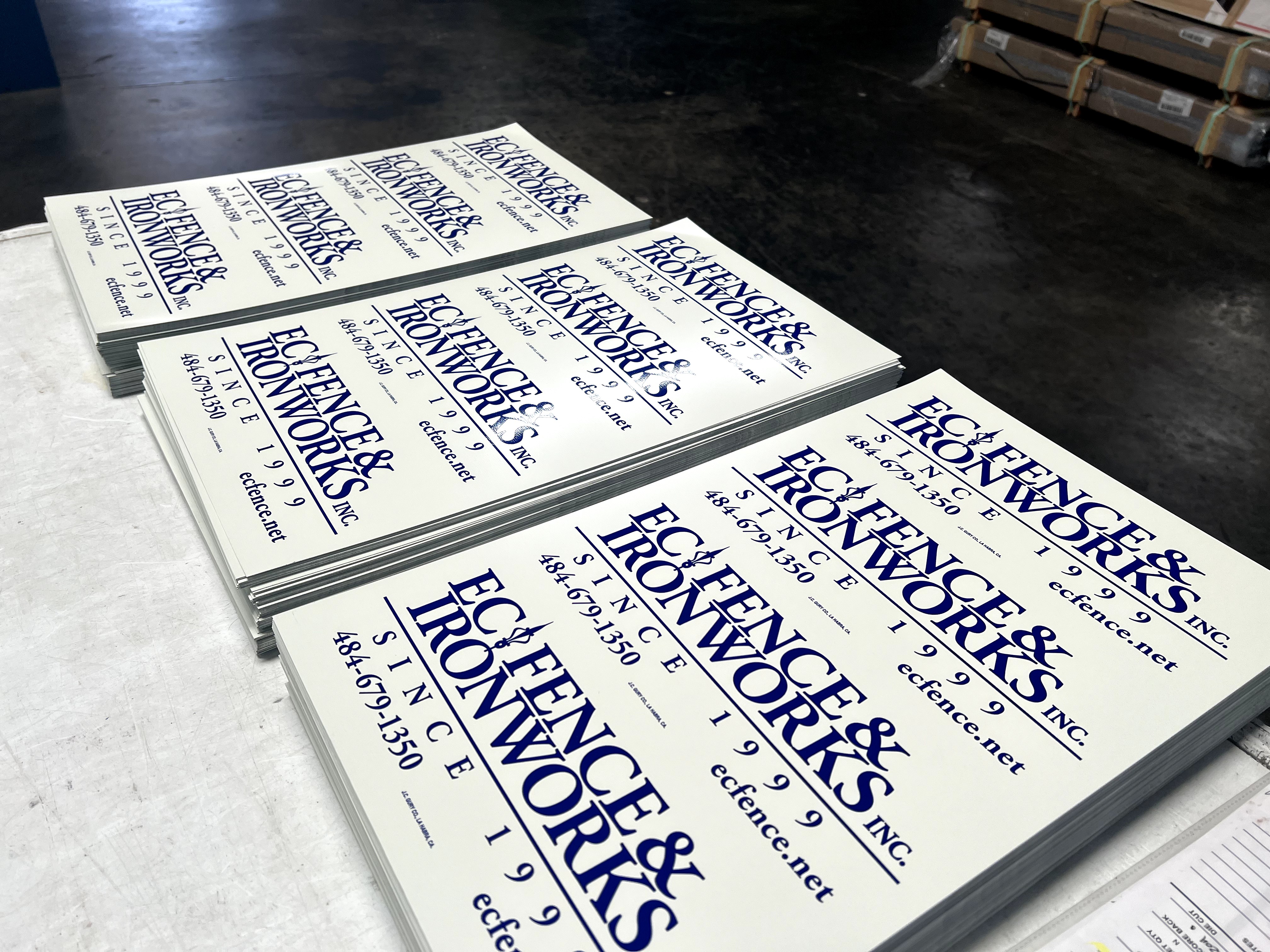 Custom blue and white rectangle sign for fence businesses