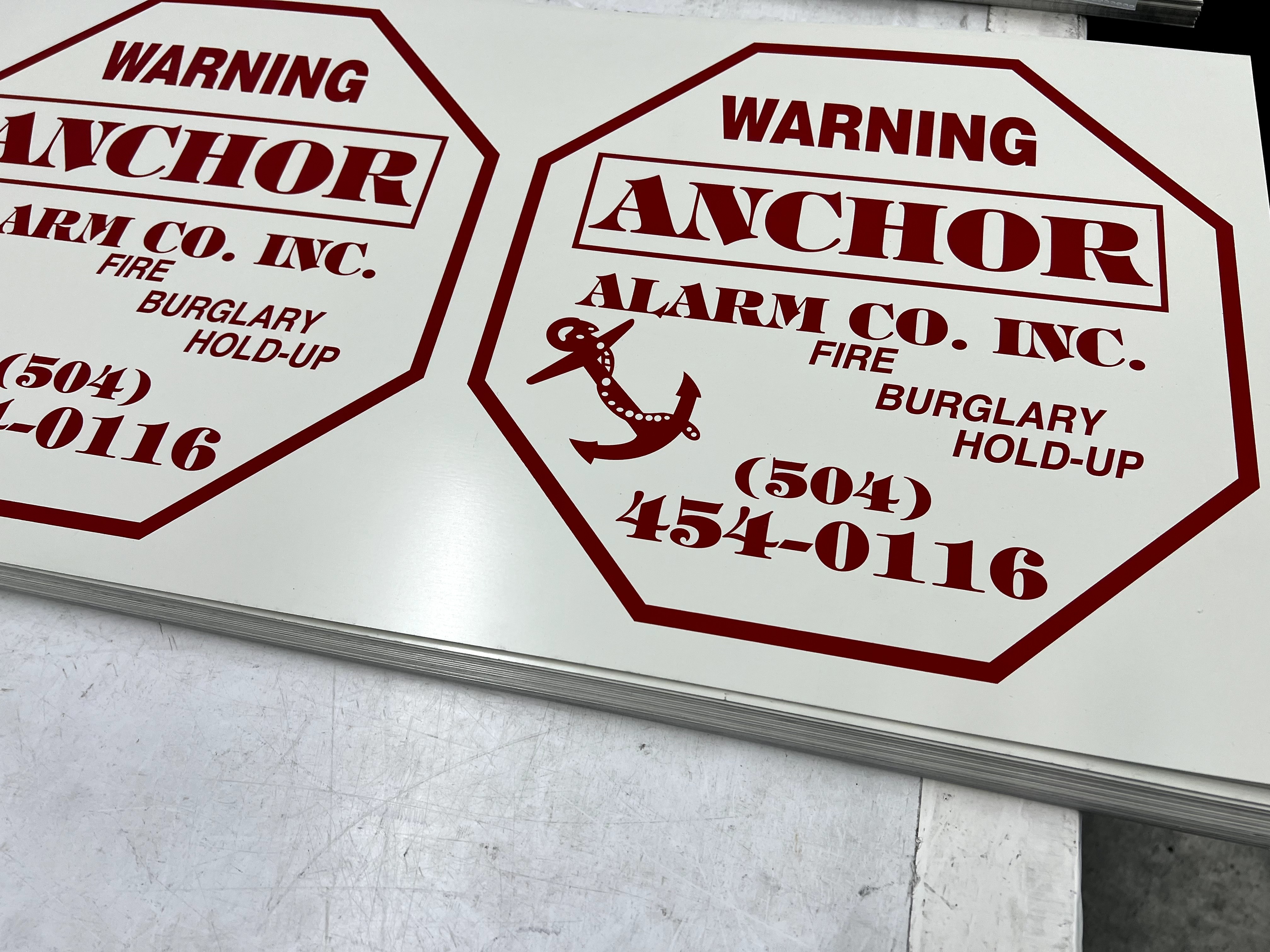 Professional security sign featuring a elongated octagon design with 1 color. Perfect for security businesses. Get a free quote today!